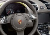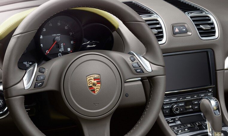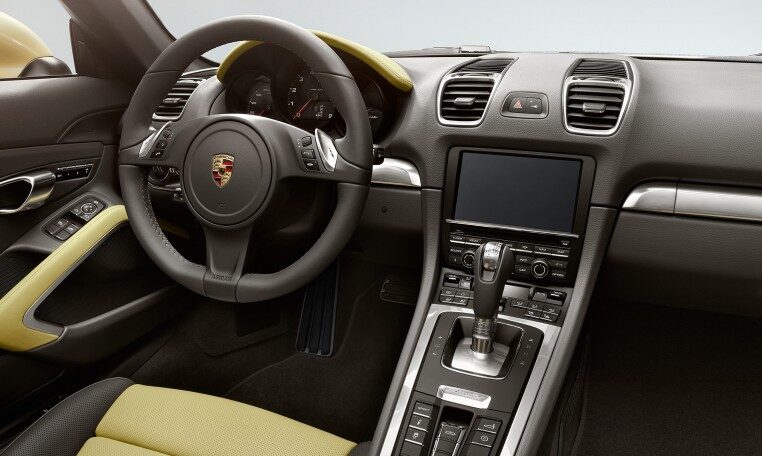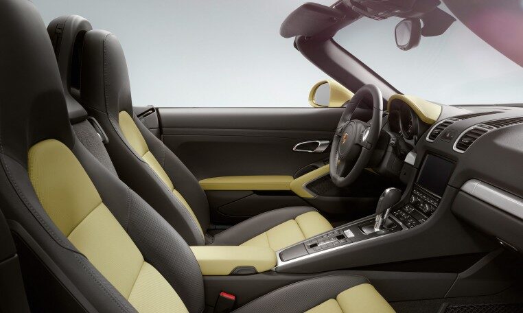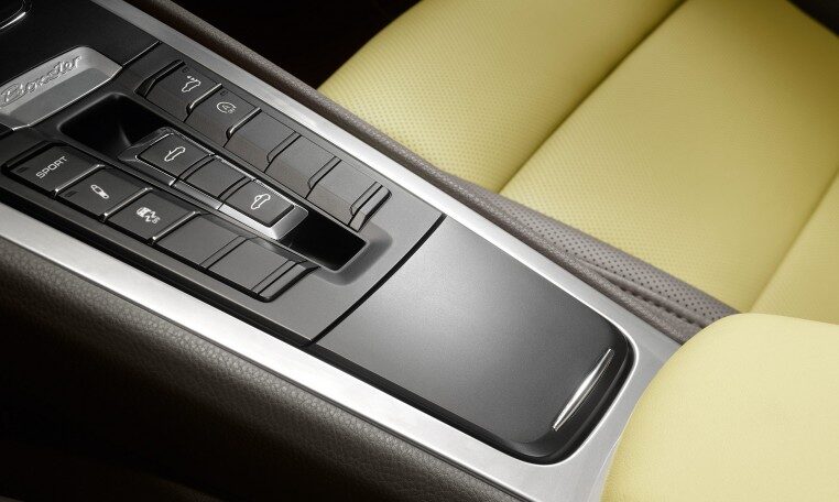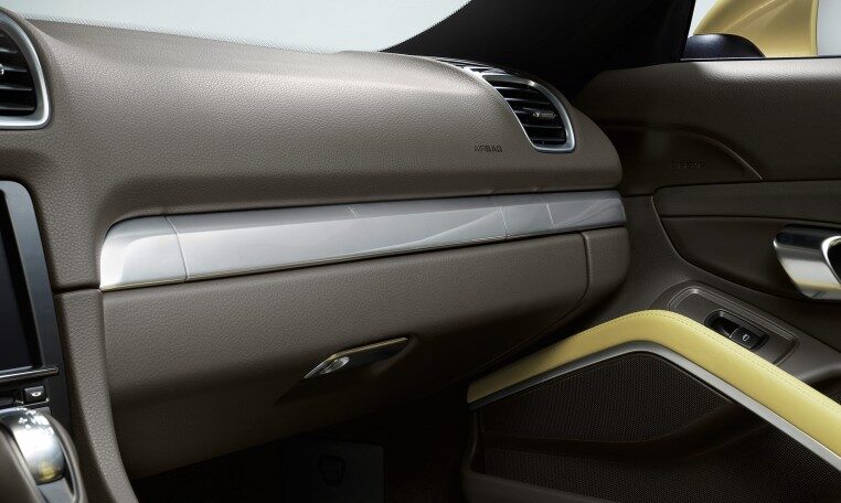 Power is transmitted to the road by 18-inch Boxster wheels. Their distinctive five-spoke design affords an unobstructed glimpse of the braking system’s black four-piston aluminium monobloc fixed calipers. And you can keep an eye on the pressure in all four tyres thanks to tire pressure monitoring (TPM). The large air inlets illustrate character. The sound produced by the central tailpipe in brushed stainless steel is unmistakably Porsche.